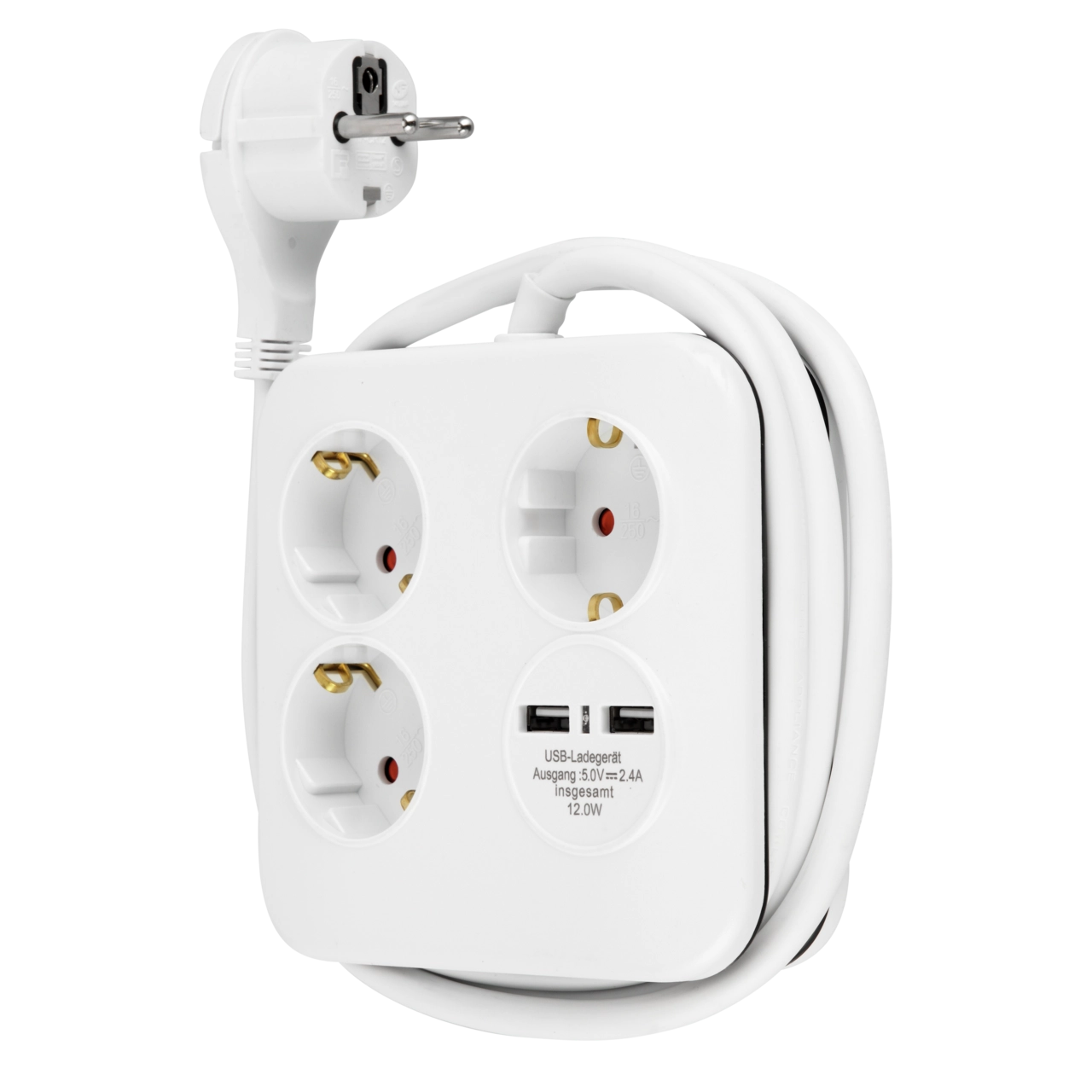 Kompakte Mehrfach-Steckdosenleiste PowerQuad mit 3 Schutzkontakt-Steckdosen für eine flexible Stromversorgung von bis zu 3 elektrischen Geräten im Haus oder in der Wohnung. Über die zwei zusätzlichen USB Steckdosen können Sie einfach Ihre elektrischen Geräte wie z.B. Handy, Smartphone, Tablet, Laptop, MP3-Player, Digitalkamera, etc. aufladen. Die besondere Bauform bietet Ihnen einen integrierten Kabelsafe. Der praktische Flachstecker der Leiste eignet sich auch für die Verwendung hinter Möbeln. Das einfache Herausziehen erfolgt über den ausklappbaren Griff am Stecker. Der flexible Stromverteiler mit 1,4 m Kunststoffleitung bietet ein kompaktes und stabiles Gehäuse aus schlagzähem Kunststoff. Alle Steckdosen sind zur Sicherheit mit einem erhöhten Berührungsschutz ausgestattet und eignen sich durch die quersitzende Bauform auch für elektrische Geräte mit Winkelstecker.