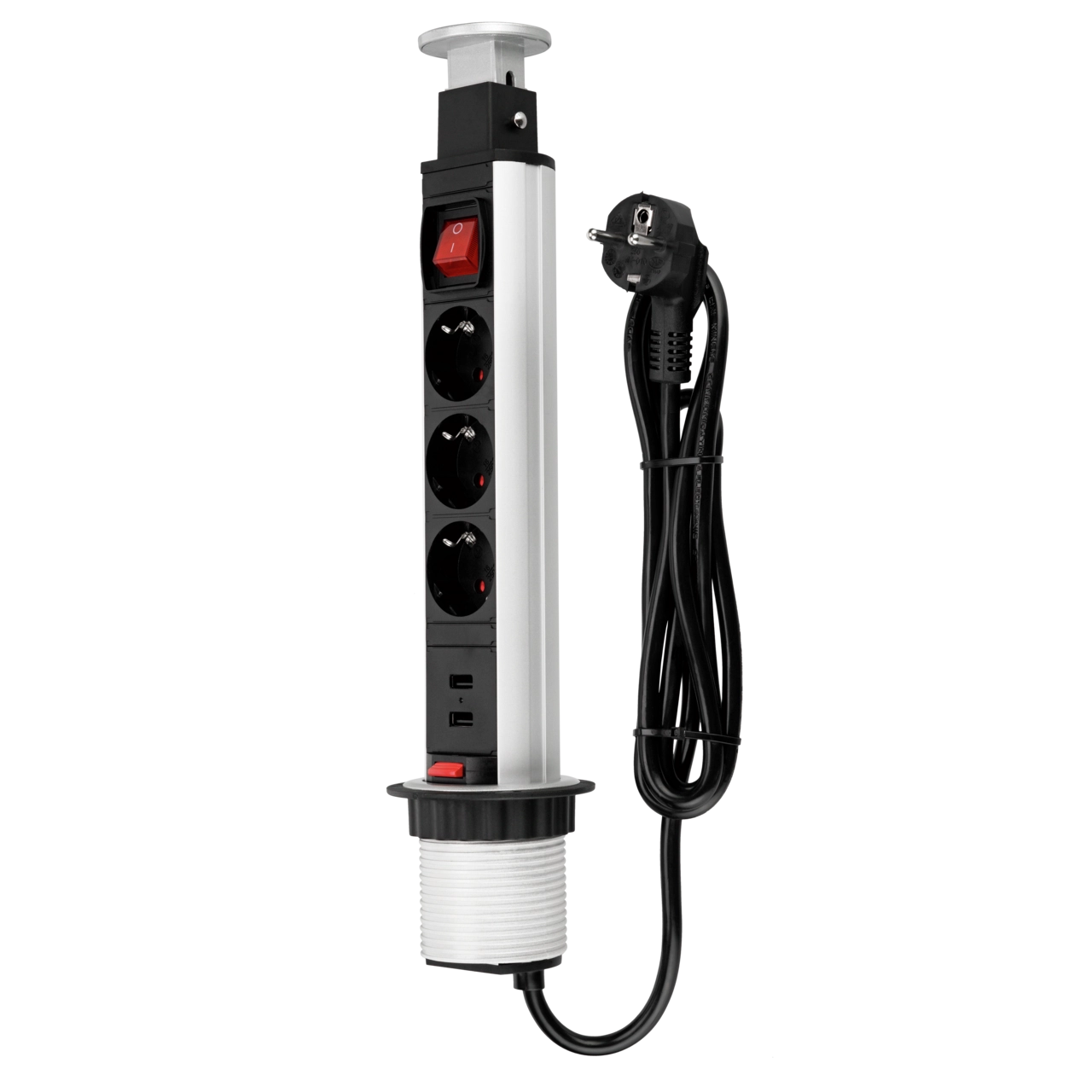 Spezielle Steckdosensäule für eine flexible und sichere Stromversorgung von bis zu 3 elektrischen Geräten im Haus oder in der Wohnung. Die Steckdose ist für einen versenkten Einbau in z.B. Schreibtischplatten konzipiert. Über die zwei zusätzlichen USB Steckdosen können Sie einfach Ihre elektrischen Geräte wie z.B. Handy, Smartphone, Tablet, Laptop, MP3-Player, Digitalkamera, etc. aufladen. Der flexible Stromverteiler mit 1,5 m Kunststoffleitung bietet ein stabiles und bruchfestes Gehäuse aus Aluminium und schlagzähem Kunststoff. Alle Steckdosen sind zur Sicherheit mit einem erhöhten Berührungsschutz ausgestattet und eignen sich durch die quersitzende Bauform auch für elektrische Geräte mit Winkelstecker. Über den integrierten, zweipoligen Ein-/Ausschalter können Sie die angeschlossenen Verbraucher sicher vom Netz trennen.