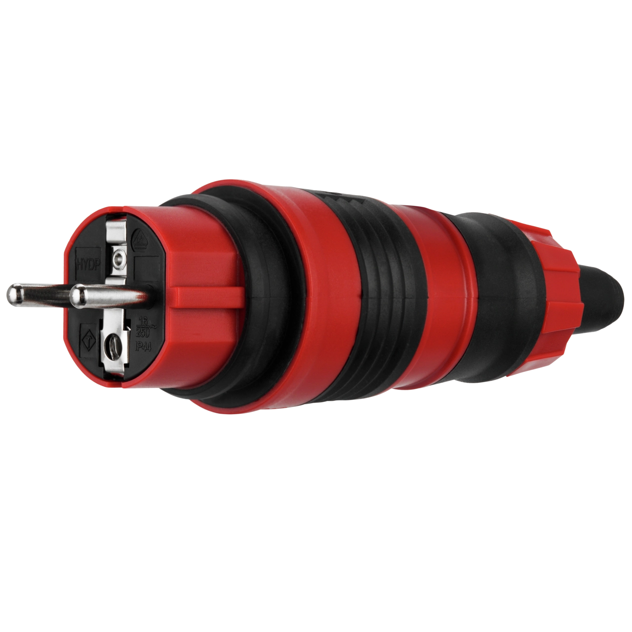 Wiederanschließbarer, robuster Gummi-Schutzkontakt-Stecker mit zentraler Kabeleinführung für die einfache Nachrüstung, Austausch oder Ersatz. Der Stecker bietet ein schlag- und stoßfestes Gehäuse aus witterungsbeständigem Polycarbonat und Gummi, geeignet für die Anwendung im Innen- und Außenbereich.