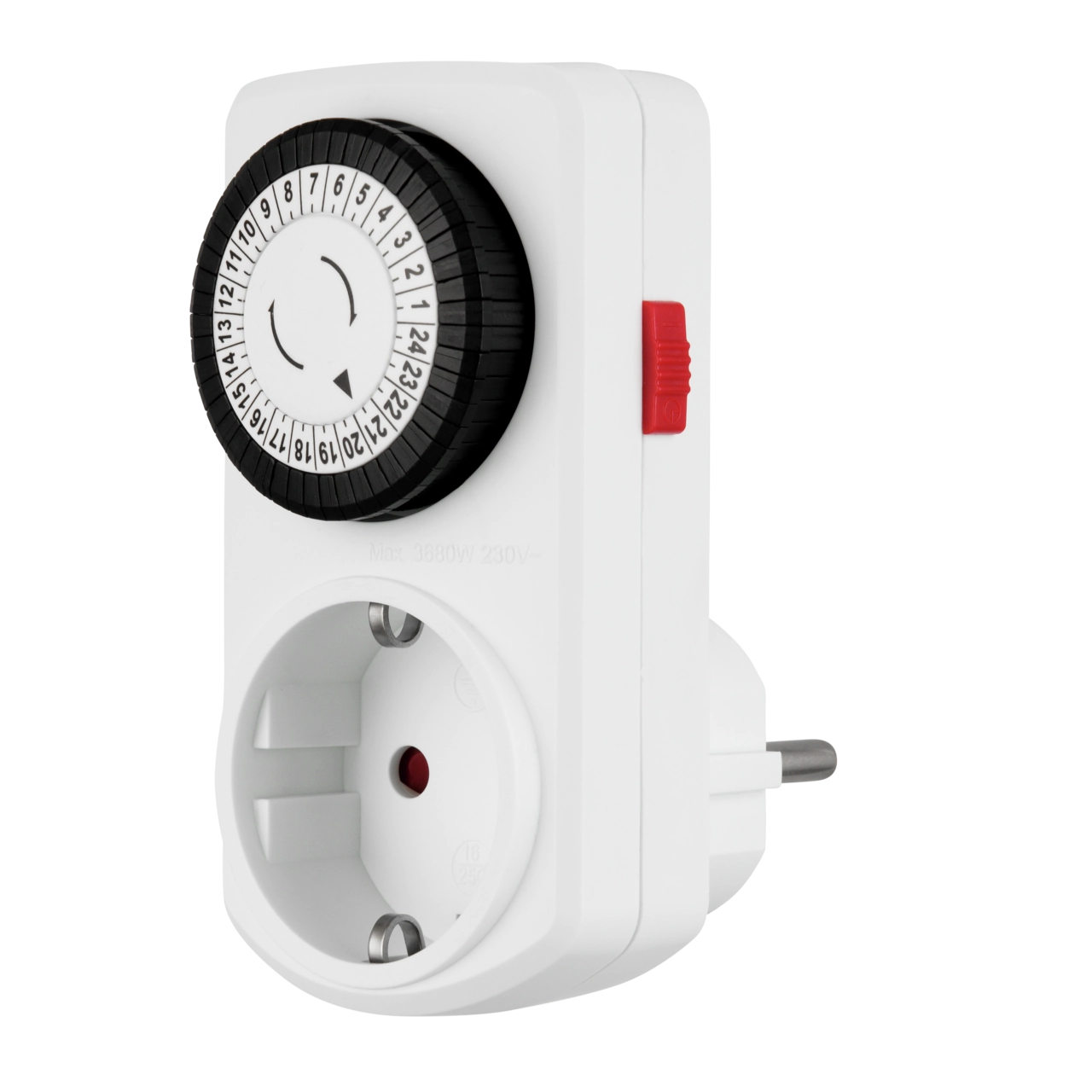 Die praktische Zeitschaltuhr in kompakter Bauform eignet sich ideal zum automatischen und effizienten steuern Ihrer elektrischen Geräte wie z.B. Tisch- und Stehlampen, Kaffeemaschinen, Aquarien oder Terrarien, Rollladen und Jalousien, Ventilatoren, Klimageräte, elektrische Heizungen, Zirkulationspumpe, Weihnachtsbeleuchtungen etc.. Sparen Sie Strom und Geld mit dem sinnvollen Einsatz der analogen Zeitschaltuhr durch Abschaltung von stromverbrauchenden Stand-by Funktionen, Nachtabschaltung verschiedener elektrischer Verbraucher oder zeitlich geplante Steuerung von Elektrogeräten wie z.B. Waschmaschine, Trockner oder andere. Die mechanische Schaltuhr punktet durch die schnelle und kinderleichte Handhabung. Einfach die Schaltstifte für die gewünschten Zeiten auf Ein-/Ausschalten stellen, die Drehscheibe der Uhr auf die aktuelle Uhrzeit drehen, in eine Steckdose stecken und den Stecker Ihres elektrischen Gerätes einstecken. Für einen Tag können Sie bis zu 48 täglich wiederholende Schaltzeiten einstellen, der kleinste Schaltabstand ist hierbei 30 Minuten. Die Uhr bietet ein zuverlässiges und laufruhiges Uhrwerk in einem kompakten und stabilen Kunststoffgehäuse. Die Steckdose ist zur Sicherheit mit einem erhöhten Berührungsschutz ausgestattet.