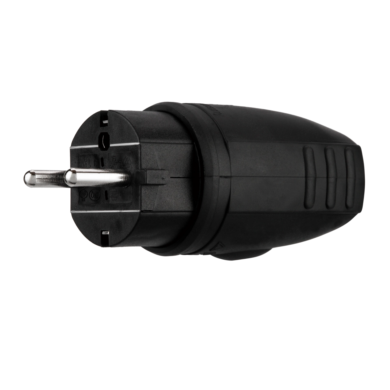 Wiederanschließbarer, robuster Gummi-Schutzkontakt-Stecker und Kupplung im Set mit zentraler Kabeleinführung für die einfache Nachrüstung, Austausch oder Ersatz. Der Stecker und die Kupplung bieten ein schlag- und stoßfestes Gehäuse aus witterungsbeständigem Gummi, geeignet für die Anwendung im Innen- und Außenbereich.