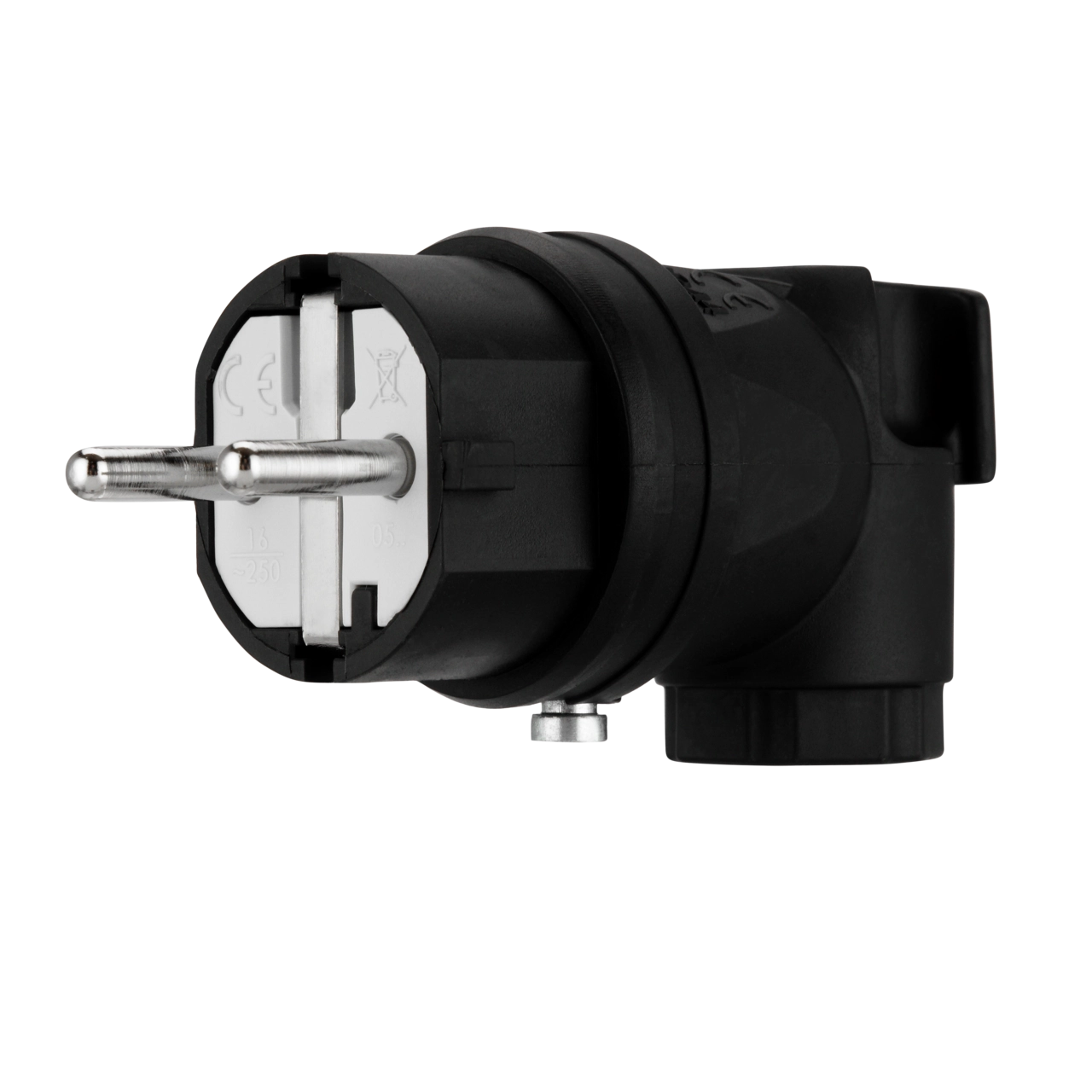 Wiederanschließbarer, robuster Vollgummi-Schutzkontakt-Winkelstecker mit seitlicher Kabeleinführung für die einfache Nachrüstung, Austausch oder Ersatz. Der Stecker bietet ein schlag- und stoßfestes Gehäuse aus witterungsbeständigem Gummi, geeignet für die Anwendung im Innen- und Außenbereich.