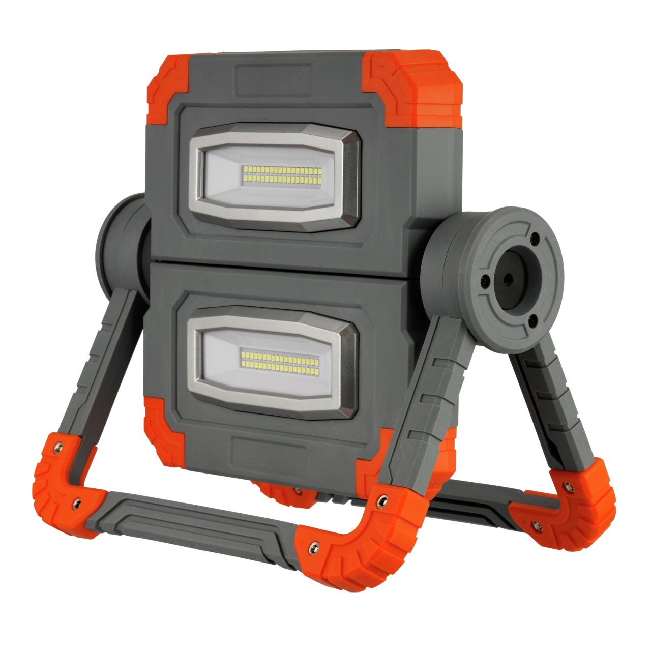 Das kabellose LED Worklight FLEX POWER ist ein faltbares Arbeitslicht aus stabilem Kunststoff, bei welchem man den beweglichen Leuchtkörper 360° rotieren kann. Die energieeffiziente LED-Technologie der Leuchte bietet eine nachhaltige und lange Lebensdauer. Mit einem effizienten Akku ausgestattet sorgt die Arbeitsleuchte überall dort für Licht, wo keine Steckdose verfügbar ist. Die Handleuchte ohne Kabel ist universell einsetzbar und somit das ideale Gerät für Arbeit, Hobby und Camping. Sie lässt sich einfach als Handlampe oder über den ausklappbaren Standfuß als Stehlampe verwenden. Zusätzlich kann man durch die integrierte Powerbankfunktion auch sein Handy laden. Sie ist sehr einfach handzuhaben und leicht zu transportieren. Die kompakte Handlampe mit 2-Stufenschalter bietet eine gute Leuchtkraft und ein helles Licht. Mit dem 2-Stufenschalter (50% - 100%) kann die Brenndauer der Leuchte bzw. der Akkubetrieb verlängert werden. Im Lieferumfang befindet sich ein USB-Kabel zum Aufladen.